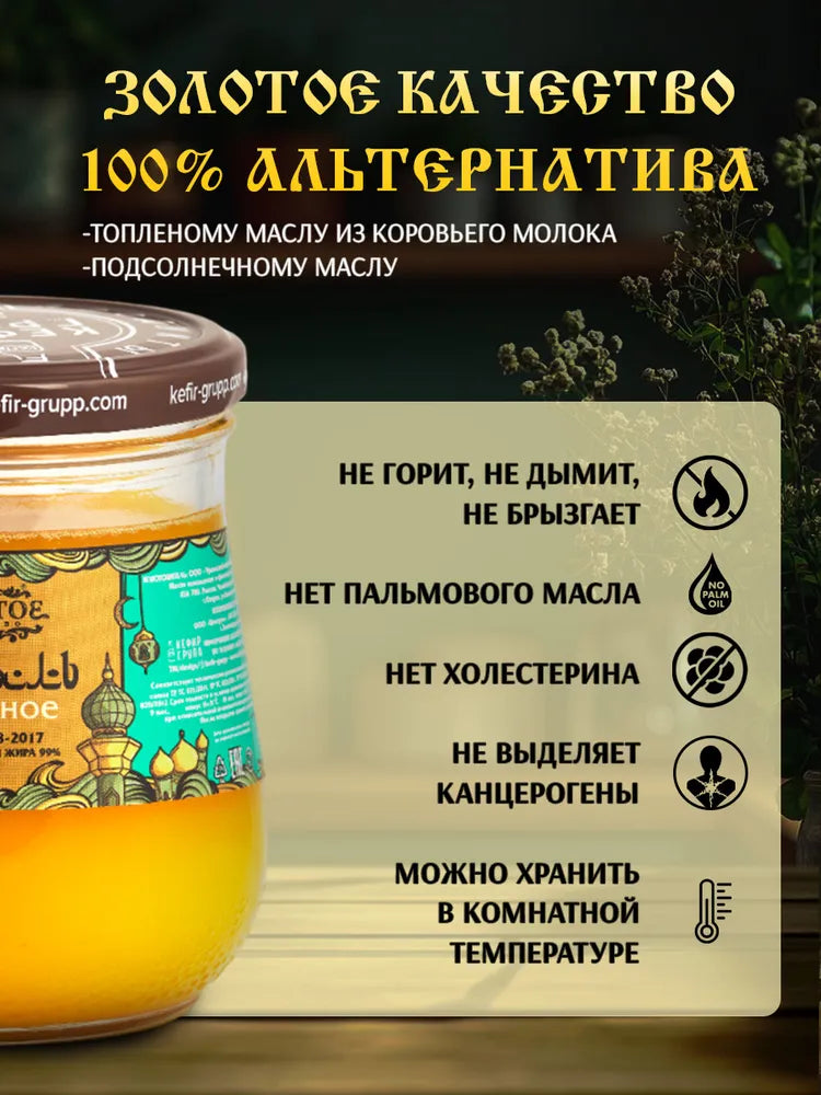 Melted butter 99% - is produced in the process of processing butter and depriving it of excess liquid, milk sugar and protein components. It is suitable for frying various dishes, such as pancakes, and contains important vitamins and microelements.