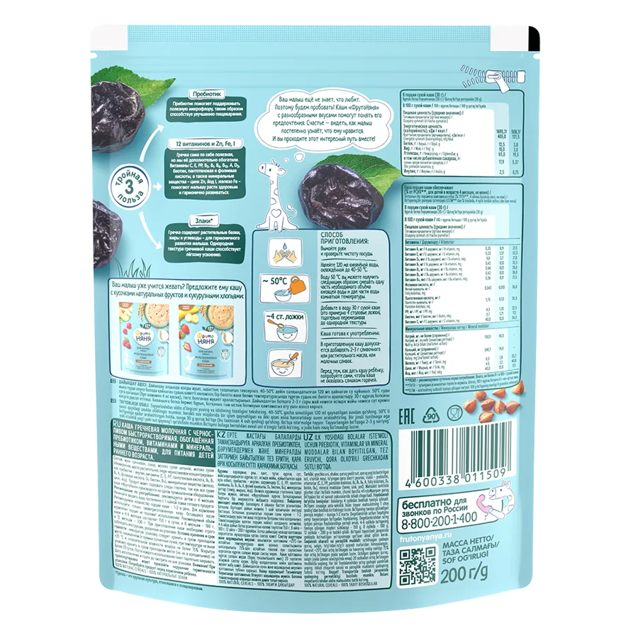 “FrutoNyanya” buckwheat porridge is both tasty and healthy, with a natural composition free from artificial colors, preservatives, and GMOs. It is additionally enriched with a full complex of vitamins and minerals to help your baby grow healthy and energetic, as well as a prebiotic to support digestion.