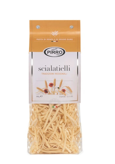 Hand made pasta scialatielli by Pirro brings authentic Italian craftsmanship to your kitchen. This 500g package of delicate, ribbon-like pasta is traditionally shaped to perfectly capture light sauces and seafood preparations. Each strand is carefully crafted by hand, delivering superior texture and flavor compared to mass-produced alternatives. Ideal for classic dishes like scialatielli ai frutti di mare, this premium pasta elevates everyday meals into restaurant-quality dining experiences. Perfect for home cooks seeking genuine Italian quality and artisanal tradition.