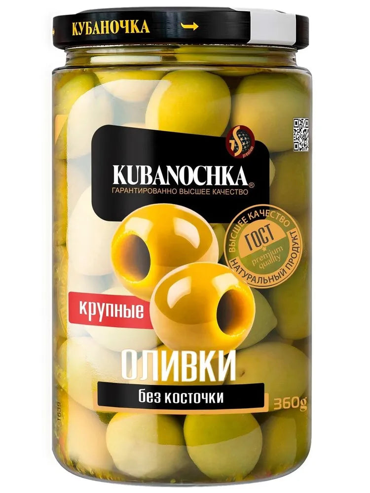 Introducing Kubanochka Pitted Olives – a high-quality product offered in a convenient set of four jars, each containing 360 g of carefully selected olives without pits.