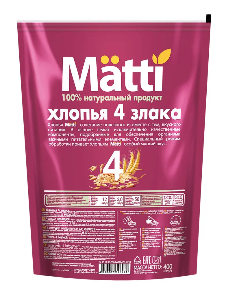 Matti “4 Grains” Instant Flakes — a mix of specially selected rye, oat, wheat, and barley flakes.